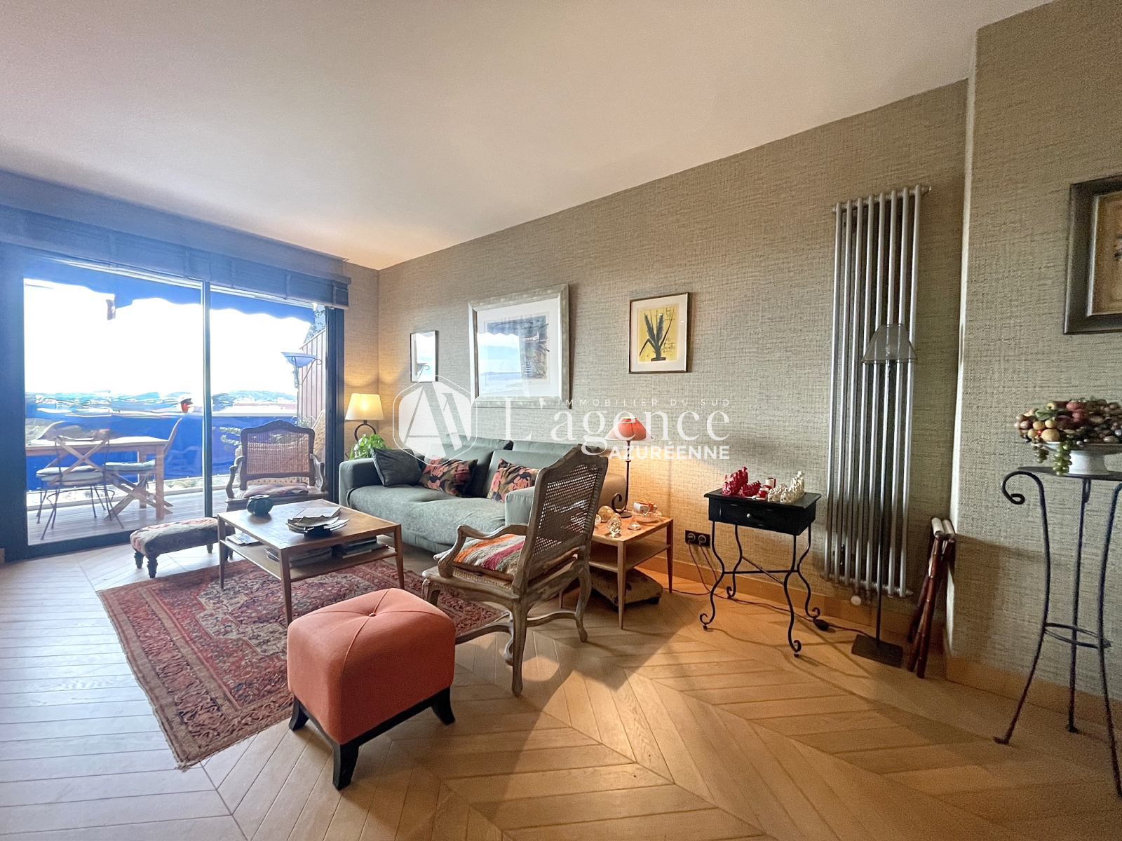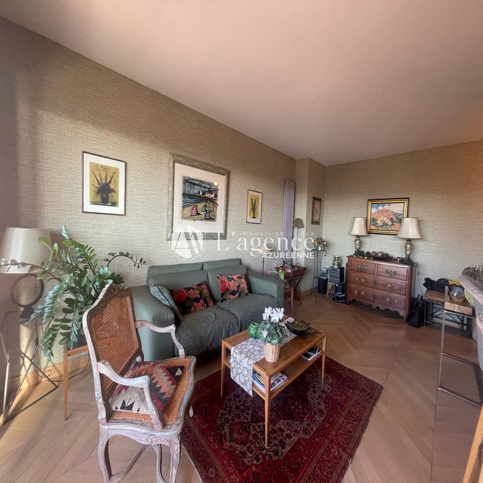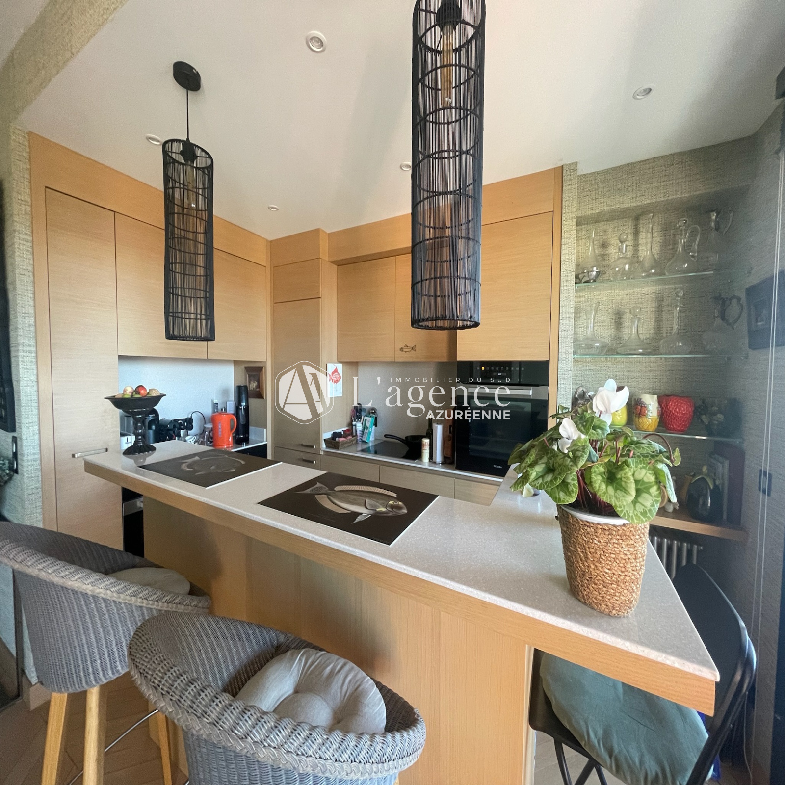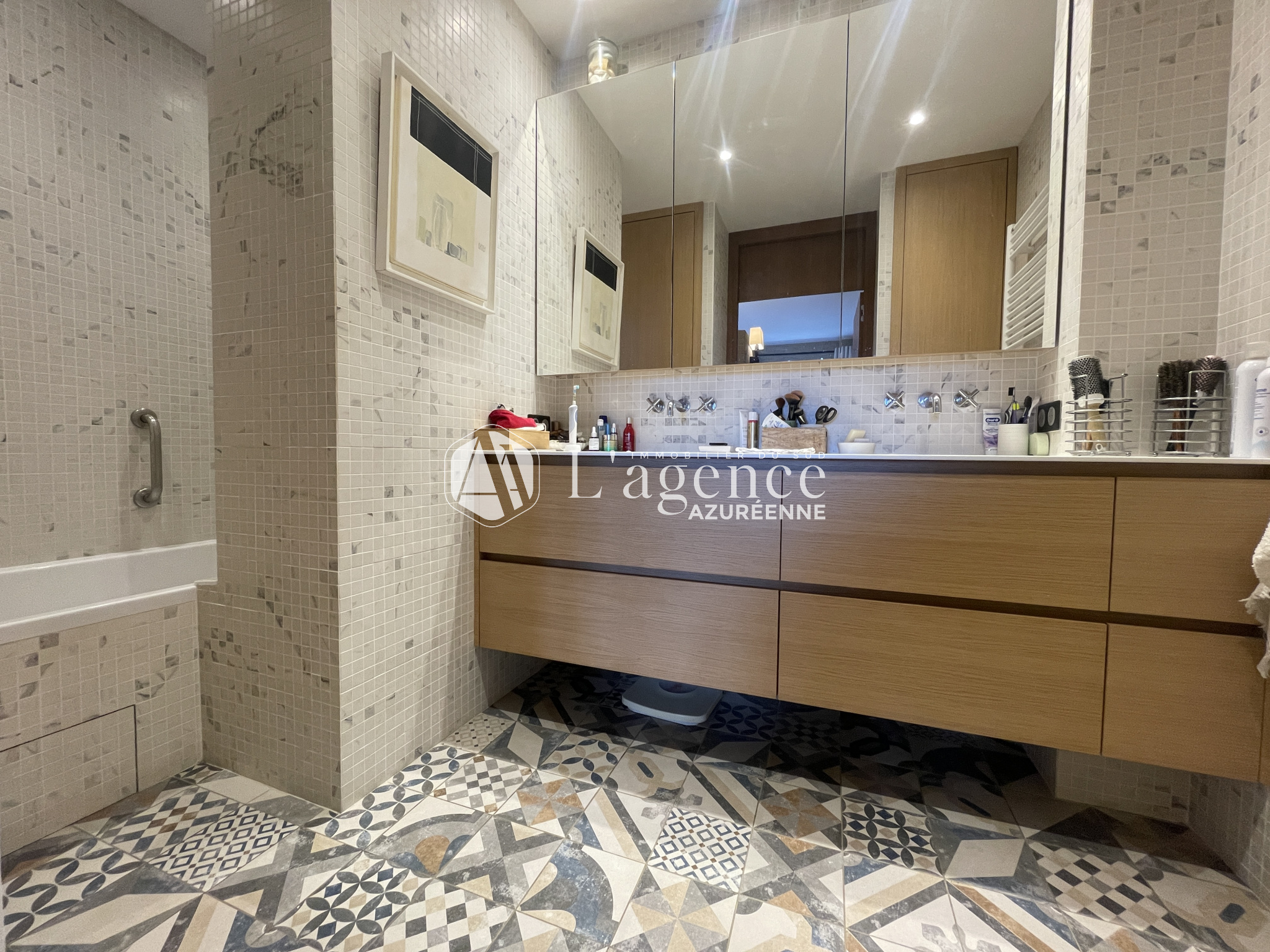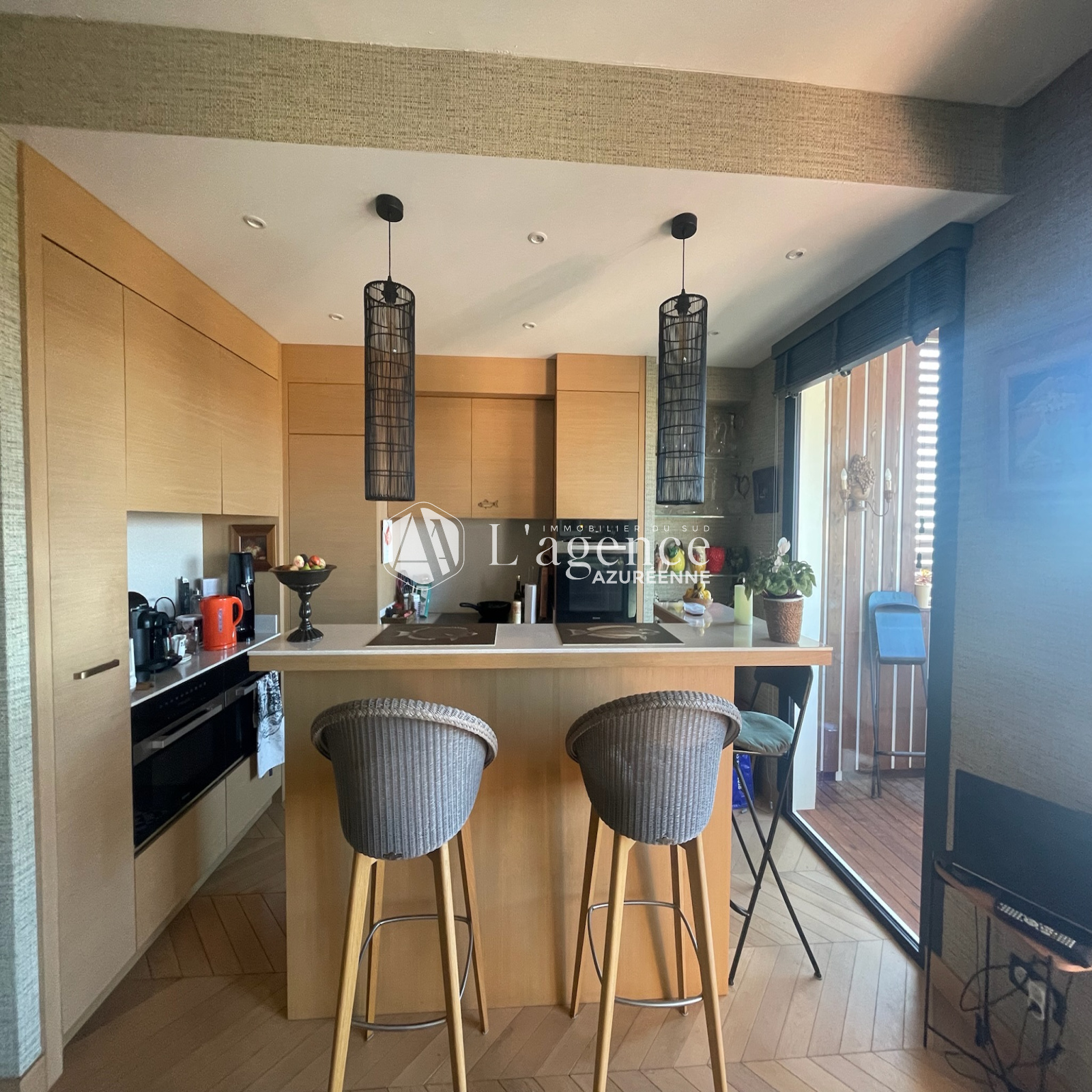 L'appartement se compose d'une entrée, d'un séjour lumineux avec cuisine américaine entièrement aménagée, donnant sur une large terrasse orientée sud-ouest, offrant une vue sur mer et montagne.