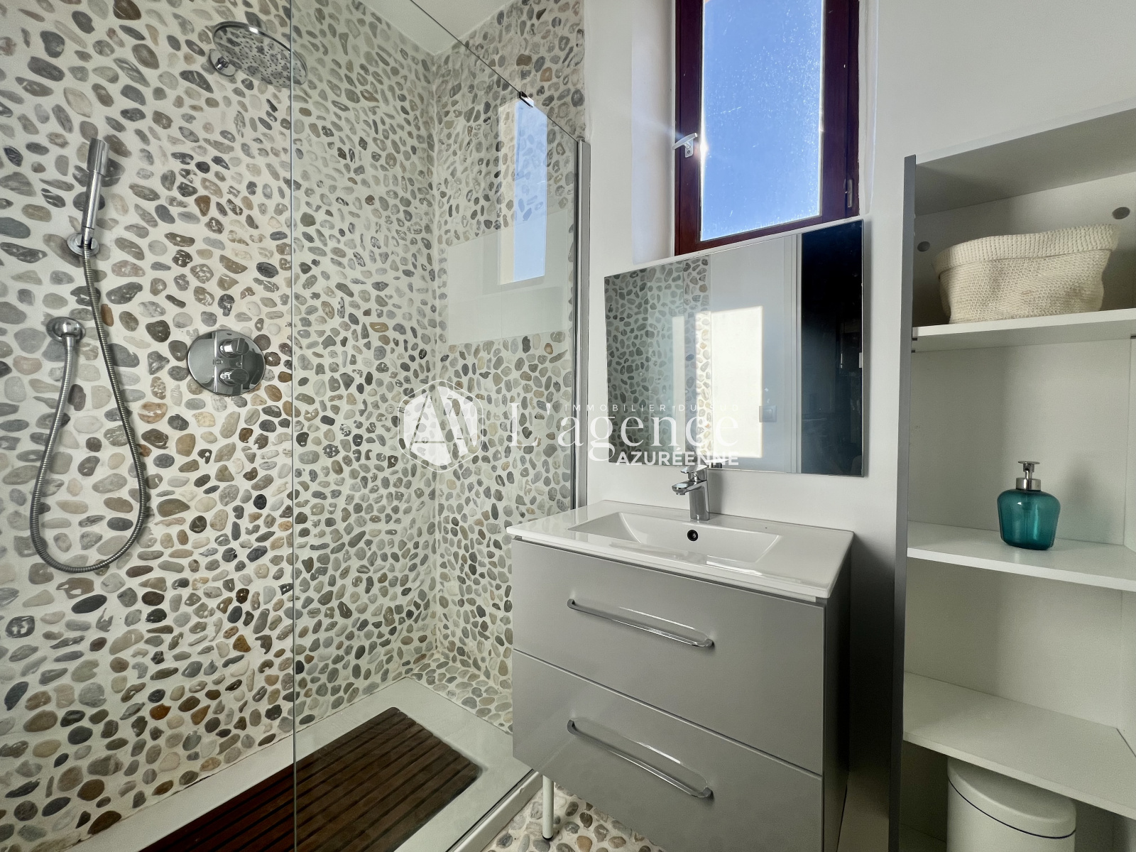 Une jolie salle de douche et des toilettes indépendants.