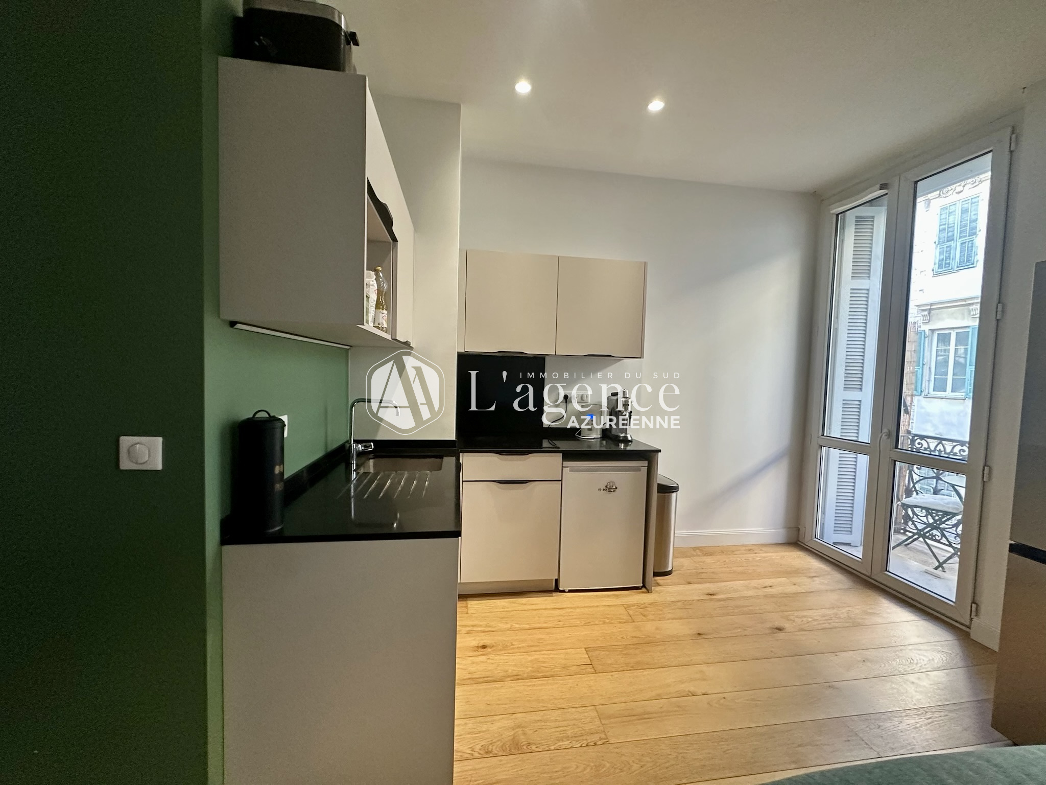 L’appartement dispose d'une cuisine moderne aménagée avec balcon, d'une grande pièce de vie et d'une grande chambre avec une salle de douche attenante donnant sur une cour intérieure au calme.