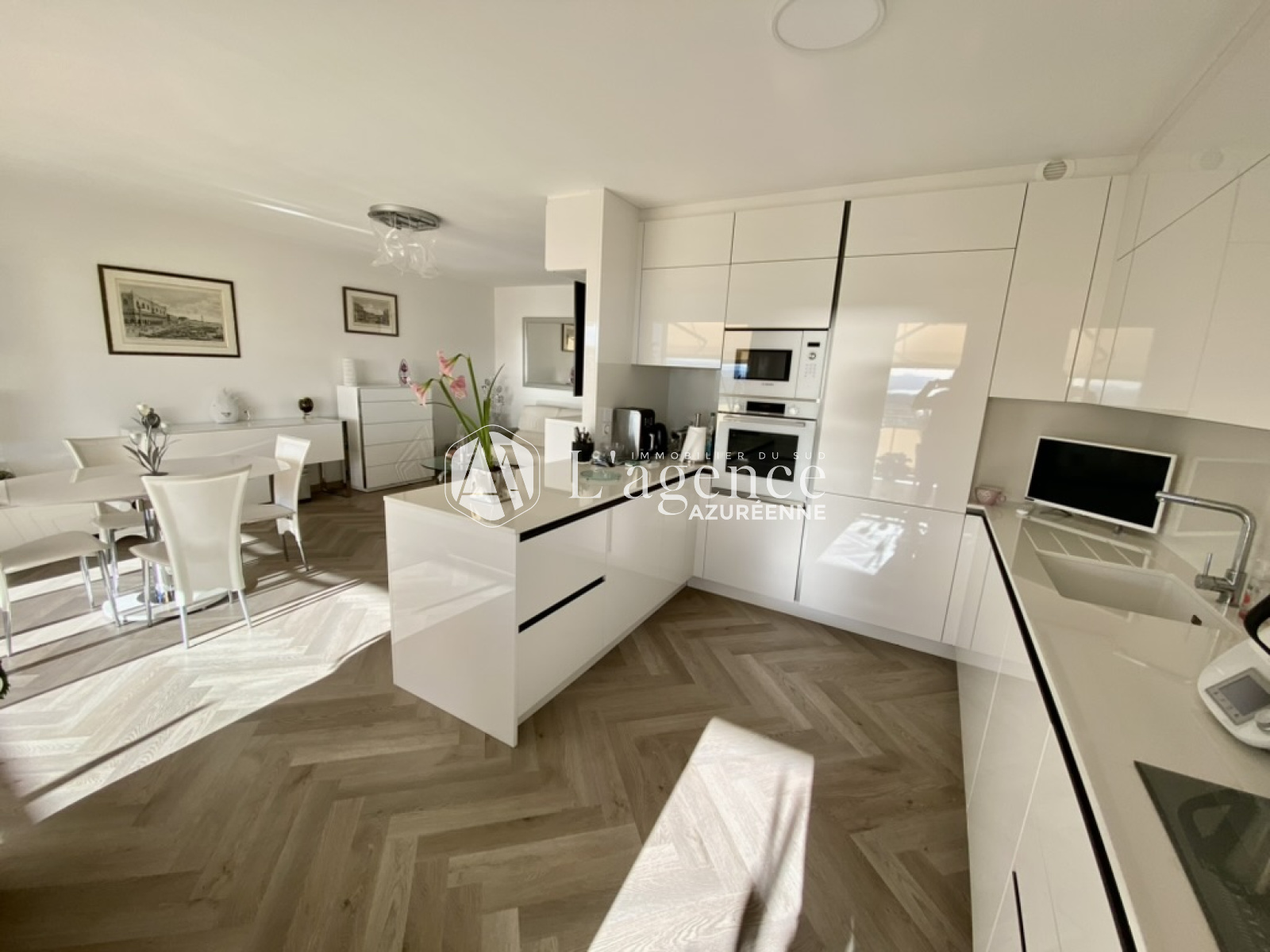 L'appartement est traversant, il est composé d'une entrée avec nombreux rangements, un séjour exposé Sud-Ouest avec cuisine italienne entièrement équipée, les deux donnent accès à une terrasse profonde et une vue mer jusqu'au cap d'Antibes.